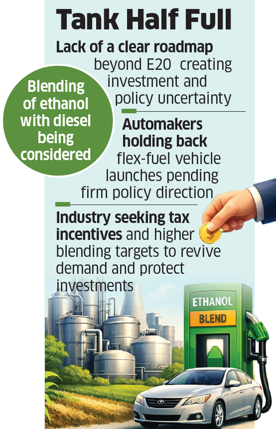 Carmakers argue that there is no firm direction on meaningfully moving beyond E20 toward high-ethanol blends, which would require widespread adoption of flex-fuel vehicles (FFVs).